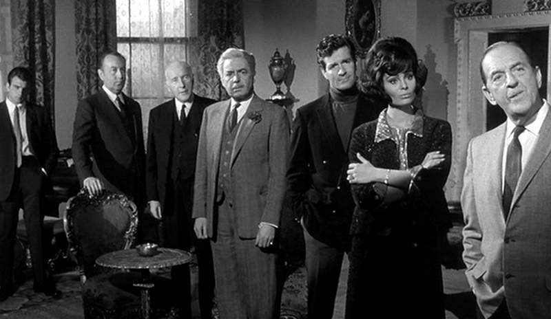 I’m not gonna lie: this was the first version of the book that I saw on screen, and at the time I loved it. The memory of my enjoyment prompted me to purchase the film on DVD many years later, and while I still enjoy it with the nostalgia the film induces in a man brought to a lifelong enjoyment of the author by this very tale, it’s kind of crazy what Towers and director George Pollock do with the original material. Like MGM, Towers embraces the concept of the source material but then does everything he can to bring it down to the standards of modern youth culture. (In all fairness, the film is based not on the novel but on the play, which is to my mind stodgier than the novel -if you’re looking for stodginess.) And so, the roles of Vera and Philip (here renamed Anne and Hugh) are played by sexy people who actually engage in sex onscreen. (Does Hugh O’Brian have the hairiest chest of any actor who had yet appeared onscreen?) Miss Emily Brent becomes fashion plate Ilona Berger, played by hot Israeli actress Daliah Lavi, and Anthony Marsden become pop icon Mike Raven, played by pop icon Fabian. A blatantly convulsive jazz score dominates the action.