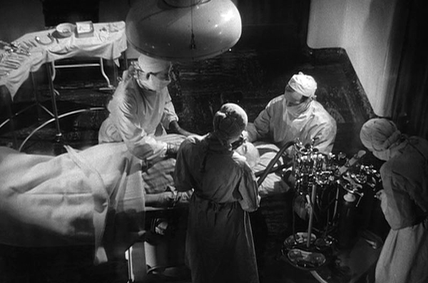 We are introduced by Cockrill to the setting (a country teaching hospital at the height of the Blitz) and the main characters: Joseph Higgins, an elderly postman who is caught in a bombing raid, and the hospital team who will operate on him. As Higgins is rescued from the rubble, brought in, cleaned up, and prepped for surgery, director Sidney Gilliat fills us in on the tensions within this medical team: the head doctor who throws off the operating sister for the pretty young nurse, who breaks her engagement with the anesthesiologist, who may have killed a past patient; the nurse who has lost her mother in an earlier raid and can’t stop grieving; the jovial nurse with the voice that causes Higgins to stir in a panic.