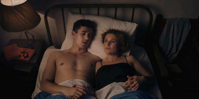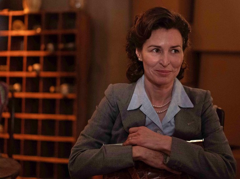 Part of the problem is that I honestly didn’t know who most of these characters were who were trapped in a hotel basement with Christie during an air raid. There’s the Asian guy who for some reason has the right to buy and publish one of Christie’s novels and who shows up with his beautiful translator and some weirdly accented bodyguard that they hired; there’s the young man whose name I know is Travis Pickford only because I looked it up on Wikipedia, who seems to have some sort of relationship to Christie that causes an emotional connection between them and who she has hired to be her bodyguard during this transaction; there’s a pair of lady tourists who are seriously underdeveloped as characters and then given a big ol’ secret; there’s the couple – he, older, looking like Kelsey Grammer, also with secrets, and she perhaps . . . his girlfriend? an escort??  Then there’s the bartender in the hotel lobby and a guy who might be his boss but speaks Italian and seems to be a gangster . . .