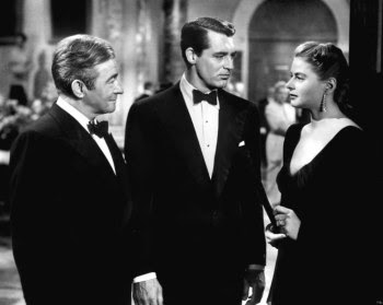 Alicia and Devlin are similarly damaged by the clash between their patriotic and personal feelings. Alicia has endured a highly public disgrace when her beloved father is convicted of treason after helping the Nazi cause. While it is made clear from a recording held by the government that Alicia despised her father’s actions, she is torn apart by the way he is paraded before the public as his arrest and trial come and go. She has resorted to drink and sex to numb her feelings, and this is how we find her the night she gives a party and finds herself drawn to a handsome crasher, a government agent named Devlin. Although it is not spelled out, Devlin has perhaps been at his job too long. He has seen the human effect of the actions his agency has taken to preserve American freedom and safety, and in order to maintain his ability to work, he has made himself numb to feeling. (I have to say that after watching Grant one week apart, first in Suspicion and now here, I have a deeper respect for his ability to act, not just wield star power.)