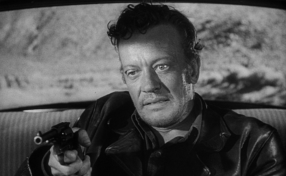 When I think of Edmund O’Brien, I immediately jump to his tour de force performance in 1950’s D.O.A.. It is . . . not subtle, but it is effective. As for Frank Lovejoy, it feels like this 50’s noir class is amounting to a Lovejoy film festival. The first week (which I missed) included the film Try and Get Me! starring Lovejoy as a family man turned criminal, while the actor played good guy detective Brub Nicolai in In a Lonely Place. Here, both men prove to be masters of subtlety, turning in deeply affecting performances of men in dire circumstances, whose friendship never wavers. But this movie belongs to William Talman as Myers. I knew Talman was something of a Hollywood bad boy. His outrageous lifestyle got him suspended from Perry Mason, where he played Hamilton Burger, the most inept district attorney in fictional history. Only the pleadings of Raymond Burr (doing his best Mason impression, I guess) could get the producers to allow Talman to return. As the murderous hitchhiker, the actor creates one of noir’s most frightening monsters, possessed of one bad eye that never closes, controlling every moment of this journey up to the second-to-last shot.