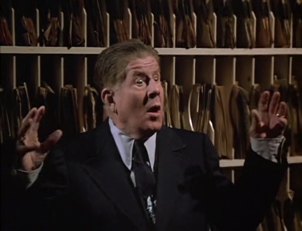 Whenever Ellery needs to take a break, he comes on down to Charlie’s diner and hangs out with the fry cook, a budding musician named Dan Murphy (Brad David). On this particular evening, Danny is bursting with news: he has shown a new song to Alvin Winer (Vallee), one of Tin Pan Alley’s great songwriters, and Winer has said the song is great. As Danny starts to hum the tune for Ellery, a familiar strain plays out of the diner radio. It turns out that Winer is the special guest of DJ Buddy Parker (Berry), who is doing a retrospective on Winer’s career. The songwriter introduces this new tune as his own, which sends Danny into a fury, and he rushes out of the diner.