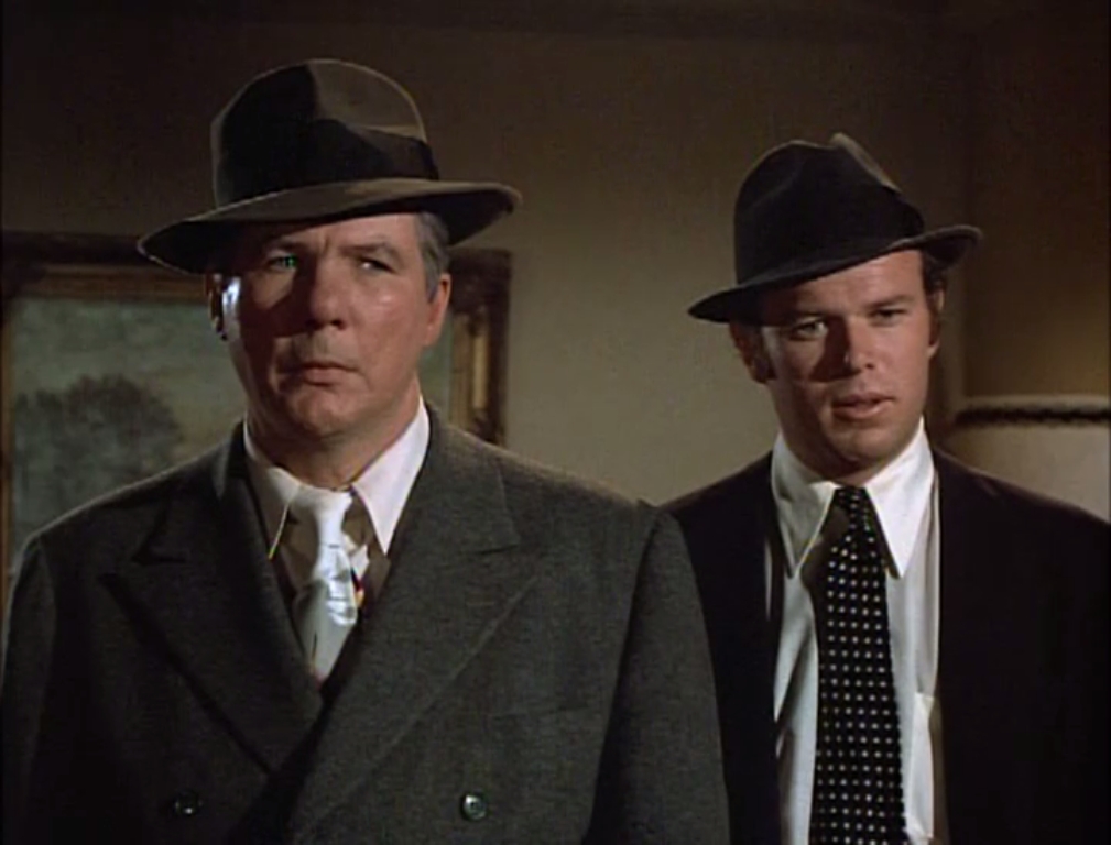 I have one complaint, but other than that, this is a gripping episode. For one thing, it’s a showcase for David Wayne. I can’t say Tom Reese was much of an actor, but Wayne’s portrayal of his fierce loyalty to Velie is an object lesson in fine acting. And because Inspector Queen is both defending the honesty of two members of his force and trying to deal with his shame in letting Caesar die under his nose, it brings out Ellery’s fierce protectiveness of his father, making this episode the perfect example of Wayne and Hutton’s great chemistry.