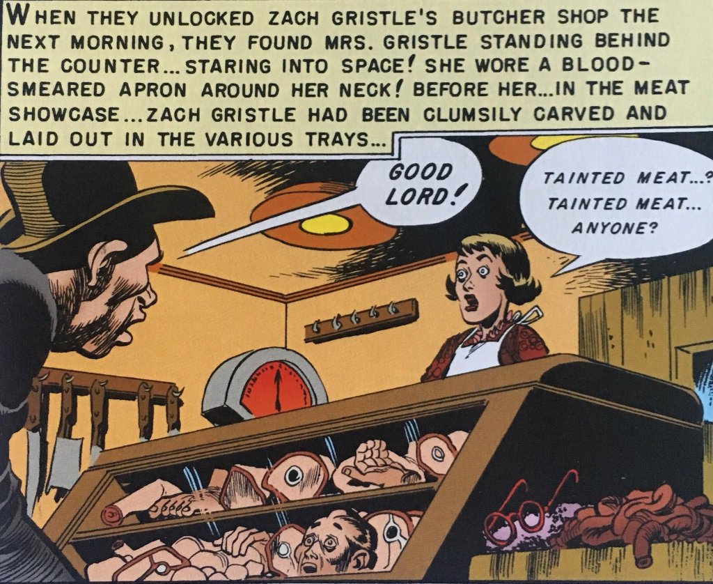 1. The above terrifying comic book illustration is from the story ‘T AIN’T THE MEAT, IT’S THE HUMANITY published in Tales From The Crypt vol1, no 32, Oct-Nov 1952. I have a copy. The illustration is actually a SPOILER since it appears right at the end ! Below is the first page of the story.