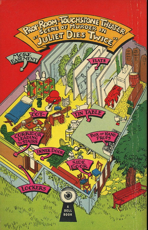 For whatever reason, Tuck seeks the help of both Miss York and Professor Brewer to find out if, as Eudora suspects, the killer is insane. One of the best aspects of the book is this wonderment, as Lewis teases the reader with odd behavior on the part of this or that person, and the attempts on Eudora’s life seem to grow exponentially. (Was the attempt to feed Eudora iodine instead of cough syrup an accident or a Freudian slip?!?) Another fun extra about this novel is that, along with Meat for Murder, the other book Lewis wrote in 1943, Juliet was published as a Dell Map-back, and Wildside Press has included that cover for both titles; unfortunately, the map at the back only appears in the other novel. Luckily, I found the one for Juliet online and include it for you here! Rest assured, like most of these, the cover is fun to look at and helps you not a whit in solving the case!