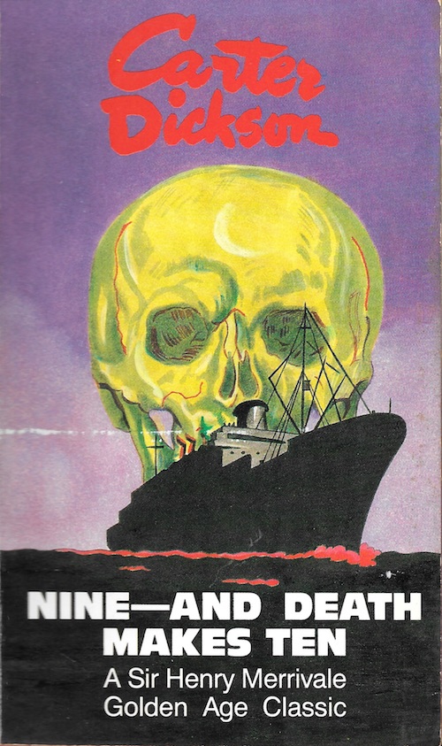 Nine – and Death Makes Ten is enjoyable from start to finish, and Dickson really ramps up the tension with the double danger from an increasingly desperate killer and the growing threat of torpedo strikes as the ship nears England. HM is funny without being ridiculous, and the humor engendered by his tussles with the ship’s barber even lead to that “aha!” moment of intuitive insight we always enjoy. Also, we do not spend too much time with Sir Henry pontificating one false theory after another, as sometimes happens; instead, there’s a nice balance of focus between our detective team and the other passengers, which provides a better display of characterization than usual.
