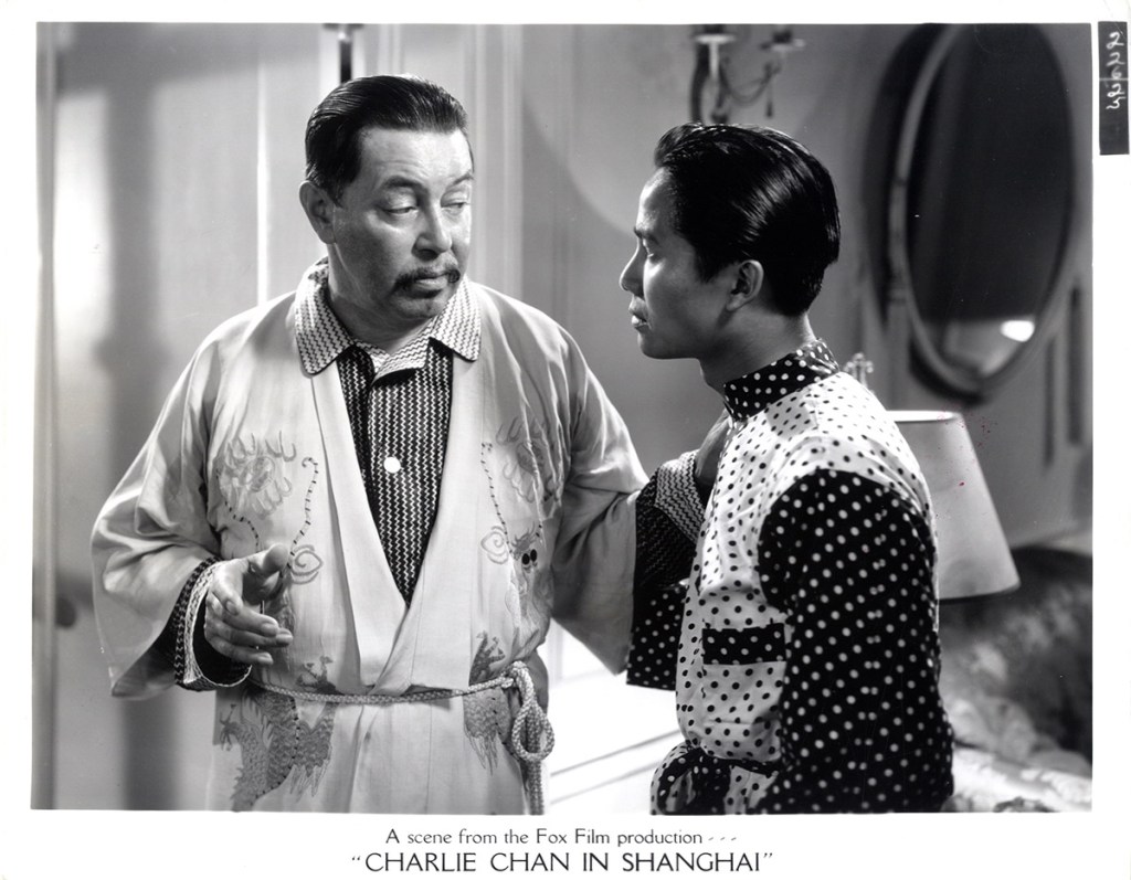 The first three Chan films actually did cast Asian performers to play the detective: Japanese actors George Kuwa and Sojin Kamiyama, and Chinese actor E.L. Park. Still, to my understanding, the character of Charlie is a minor one in these films. For the rest of its span from 1931 – 1949, first at 20th Century Fox and later at the Poverty Row Monogram Studios, Chan was played by white actors: Warner Oland in sixteen films, followed by Sidney Toler, who played Chan in eleven films for Fox and eleven more at Monogram. Following Toler’s death, he was succeeded by Roland Winters for six more films.