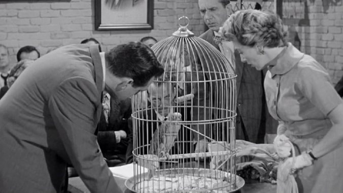 “The Case of the Perjured Parrot” premiered on December 20, 1958, as the eleventh episode of the second season of Perry Mason. The best I can say for it is that it features performances by two droll comic veterans of classic TV: Joe Kearns (Mr. Wilson in the sitcom Dennis the Menace) plays a character that is not a member of the police but serves the same function as Sergeant Holcomb in the book; Edgar Buchanan (Uncle Joe from Petticoat Junction) gets top billing as the Coroner. Whole swaths of dialogue are taken from the novel, and much of the plot is, well, kinda sorta familiar. But book characters are cut, new ones are created (one of these is the murderer!) and the plot is severely truncated.
