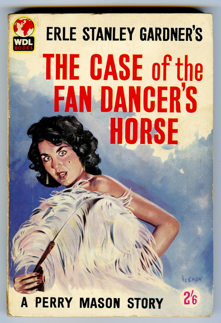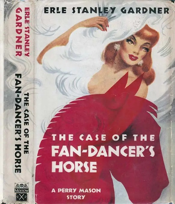 The next morning, faced with the usual stack of boring mail, Mason decides he’d rather go looking for fan-dancers. He places an ad in the paper and receives a grateful response from a woman named Lois Fenton, who goes by the stage name “Cherie Chi-Chi!” (Coincidentally, that was my own byline on my junior high school newspaper!) Lois informs Mason that a man acting as her agent will visit him to retrieve her lost property. But that property turns out to be not ostrich fans but a missing horse, a seven-year-old chestnut gelding with fine markings and possibly one marking that’s not so fine: a bullet wound. And not one, but two men arrive acting as agents for Lois Fenton. Soon enough, Perry figures out that there are two fan-dancers named Lois Fenton, a.k.a. Cherie Chi-Chi, and that something funny is going on with the feathers and the agents and the dancers and the horse!