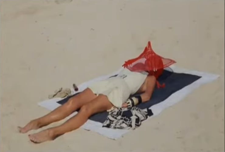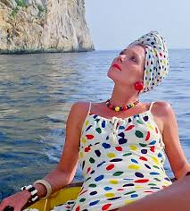 “It was then that a woman came down past them from the hotel to the beach. Her arrival had all the importance of a stage entrance. Moreover, she walked as though she knew it. There was no self-consciousness apparent. It would seem that she was too used to the invariable effect her presence produced. She was tall and slender. She wore a simple backless white bathing dress, and every inch of her exposed body was tanned a beautiful even shade of bronze. She was as perfect as a statue. Her hair was a rich flaming auburn curling richly and intimately into her neck. Her face had that slight hardness which is seen when thirty years have come and gone, but the whole effect of her was one of youth – of superb and triumphant vitality . . .There was that about her, which made every other woman on the beach seem faded and insignificant. And with equal inevitability, the eye of every male present was drawn and riveted on her.”